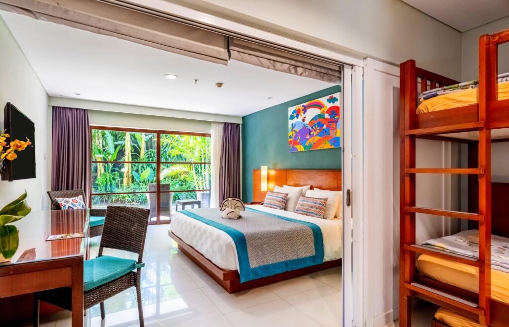 Located on the ground floor overlooking the resort gardens and features direct access to the lagoon pool. Kids safety gate provided on terrace. Room size is 42m². Bedding is 1 King Bed + 1 Bunk Bed + 1 Trundle Bed. Maximum room capacity is 5 Adults & Children.
