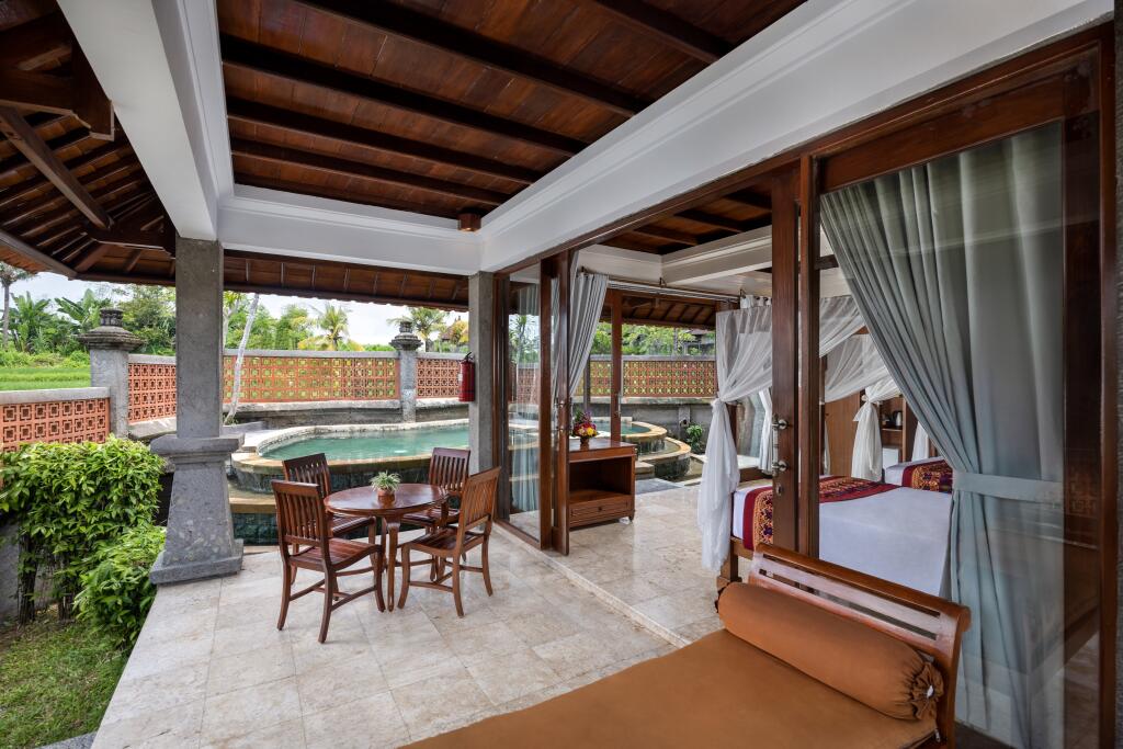 These villas are designed to harmonize with the exotic surroundings, offering views of the rice terraces and resort landscape. Featuring a luxurious bedroom, impressive living area and large bathroom with shower and semi outdoor bathtub. Room size is 262m². Bedding is 1 King Bed. Maximum room capacity is 3 Adults & Children.