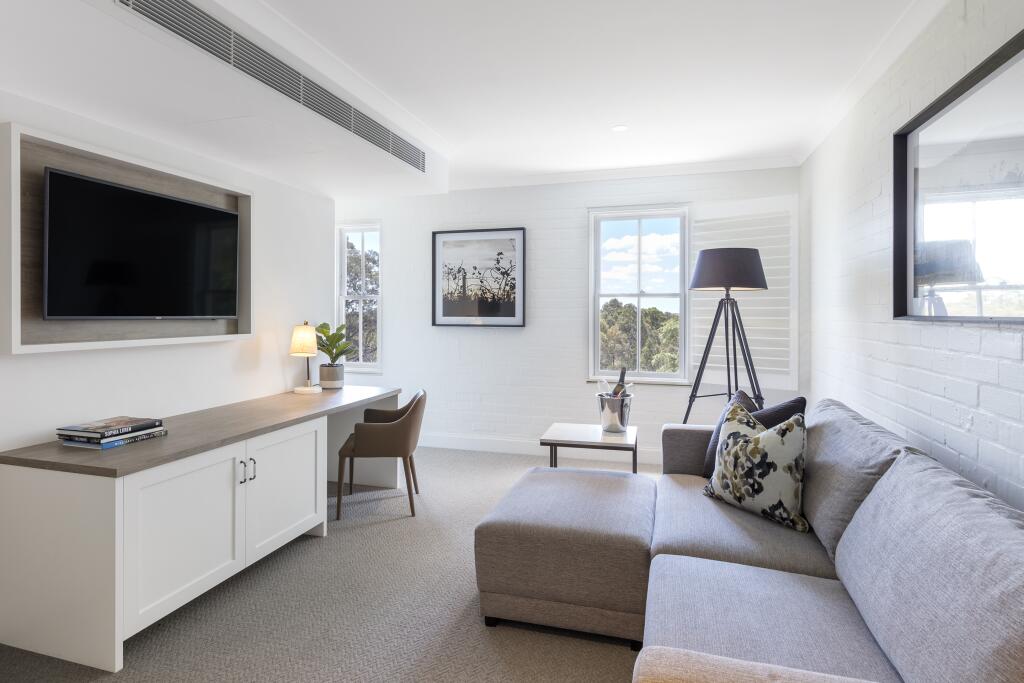 These suites offer a separate living area with views onto the front lawn area. Bedding is 1 King Bed. Maximum room capacity is 2 Adults + 1 Child. This room type is available from 1 April 2026.