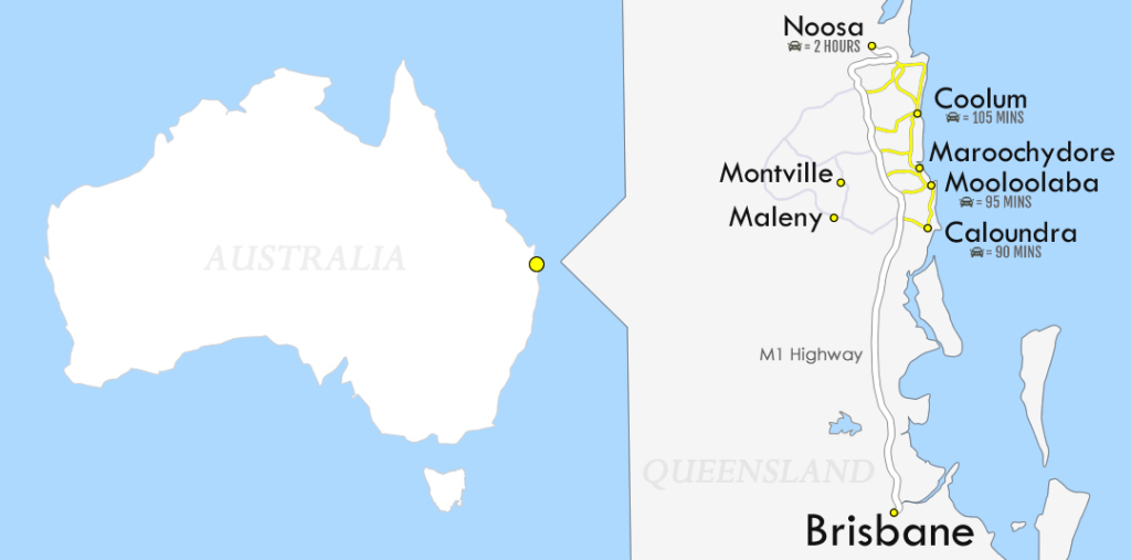 Those wishing to visit Noosa should allow a little extra time with the trip from Brisbane taking just under 2 hours thanks to its northerly position. Those visiting popular holiday destinations such as Caloundra, Maroochydore, Mooloolaba, Coolum, Marcoola and Alexandra Headland should allow anywhere from just over an hour to a full two hours to arrive, taking the Bruce Highway north from Brisbane and exiting at either Caloundra Road, the Sunshine Motorway, Eumundi-Noosa Road, Maroochydore Road or King Street and following the signs into the main town centres. Be sure to allow time to enjoy the stunning scenery and popular tourist attractions along the way.