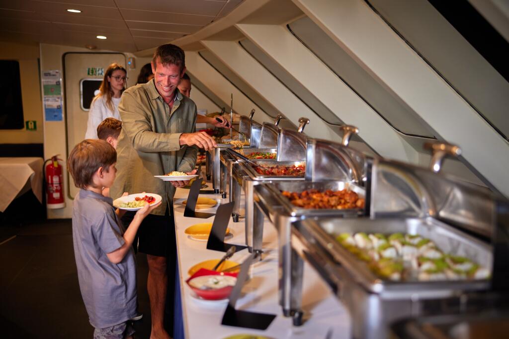 Set sail aboard Spirit of Cairns' 26 metre sailing catamaran on the calm waters of Trinity Inlet for an evening of fantastic dining. The ultimate in waterfront dining, your cruise includes a buffet dinner and complimentary beverage on arrival. Stroll the decks of the vessel and admire the view over Cairns city as the sky transforms from late afternoon to the darkness of night.